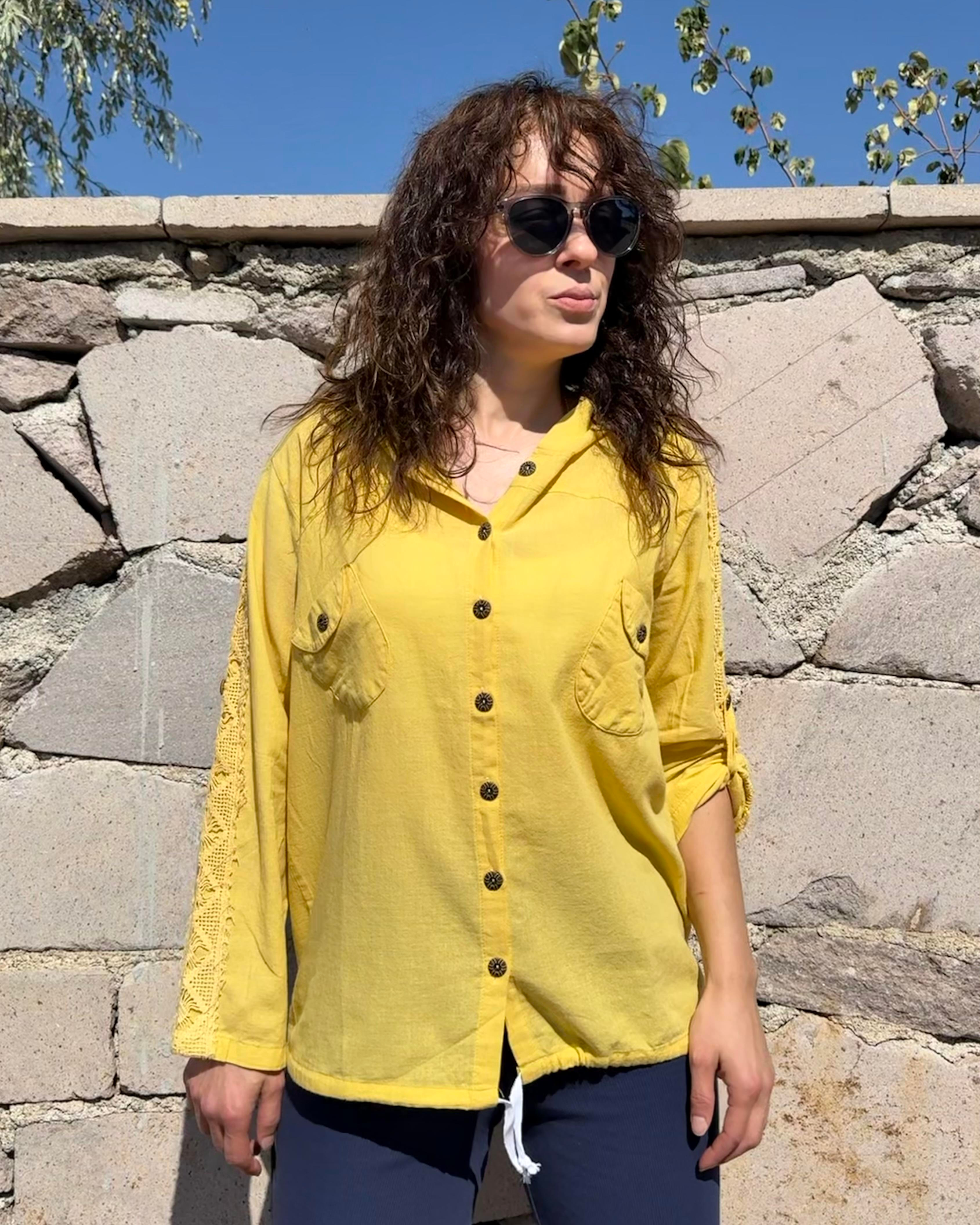 Hardal Sarısı Kapüşonlu Kollar Katlamalı Oversize Kol ve Sırt Dantel Detaylı Müslin Kumaş Gömlek