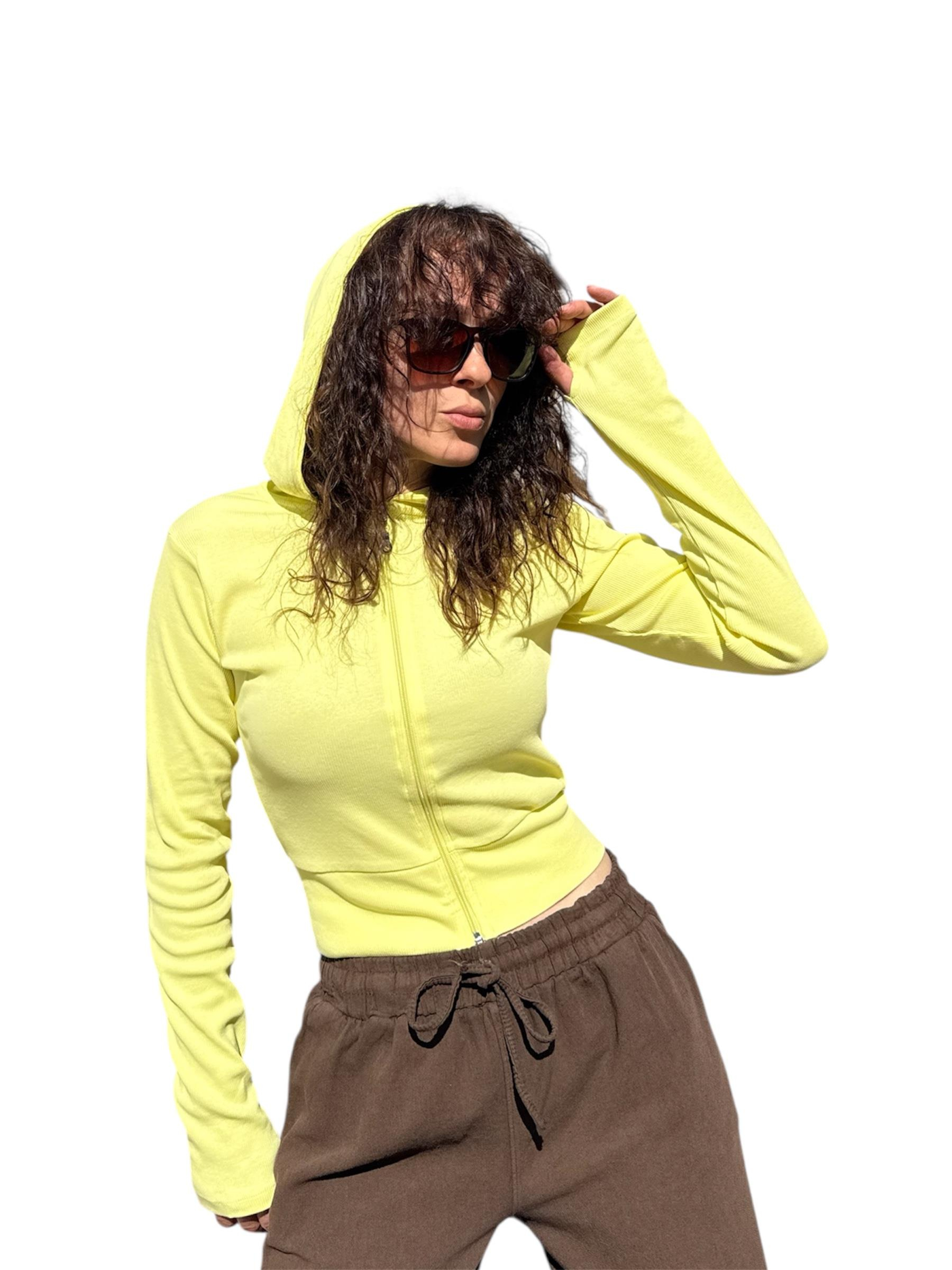Sarı Ribana Dokulu Kapüşonlu Kısa Sweat