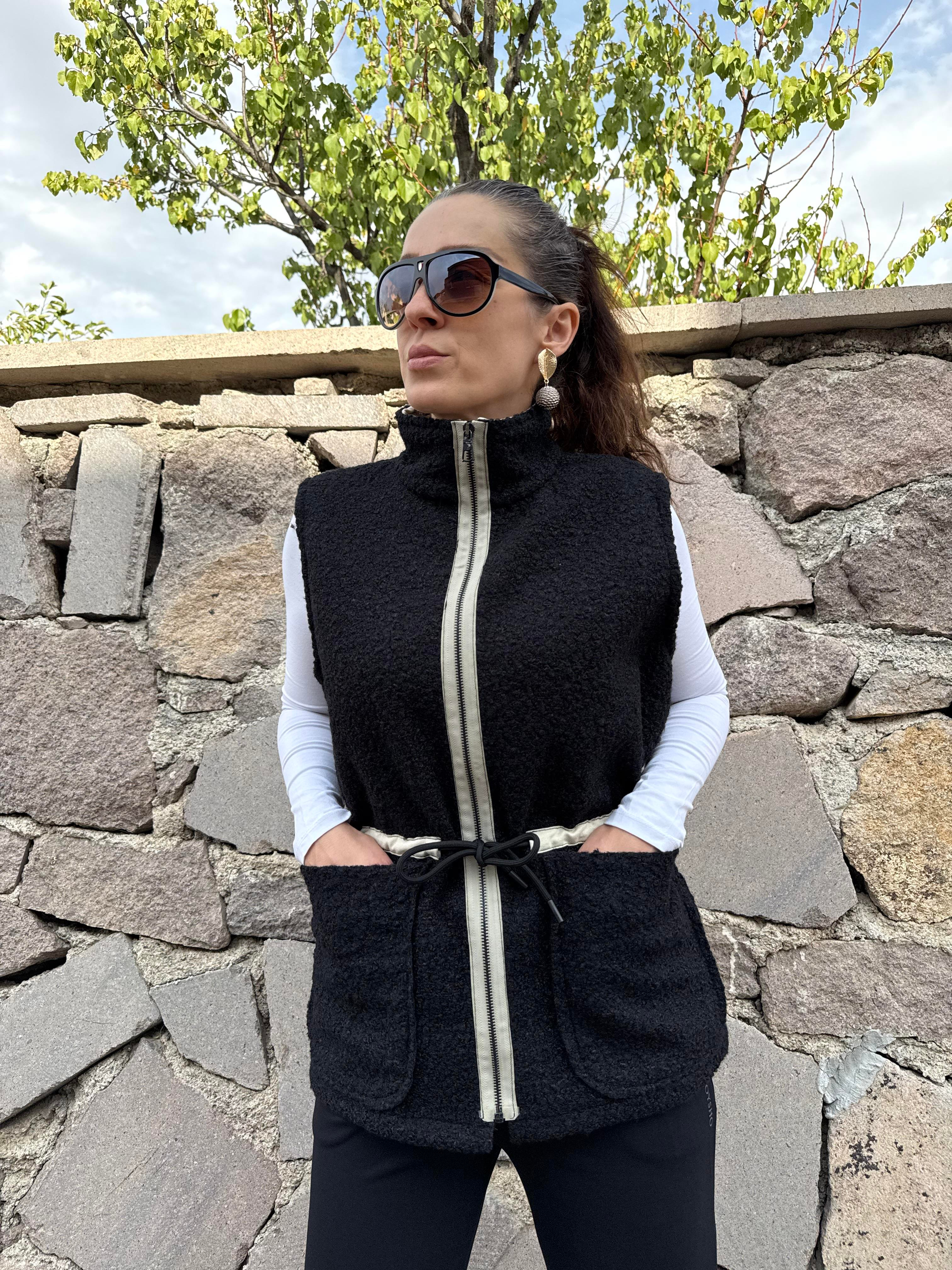Siyah Kuzu Dokulu Fermuarlı Cepli Bel Bağcıklı Peluş Yelek